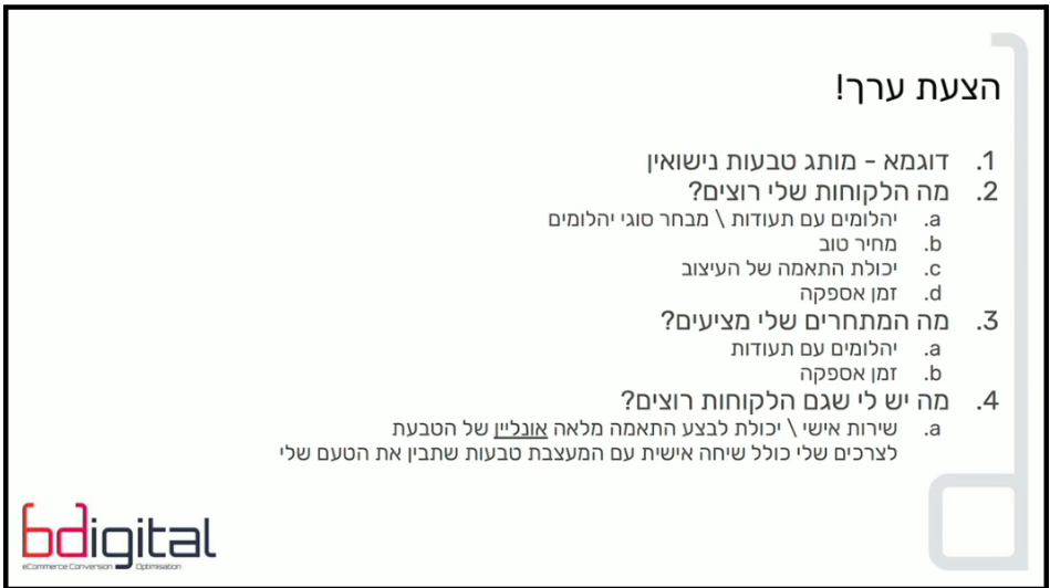 - טבעות נישואין: הלקוח רוצה תעודה גמולוגית ומחיר טוב (כמו כולם), אבל הוא לחוץ על זמן אספקה. נקודת בידול: “יכולת התאמה מלאה אונליין (ללא נציג) ותמיכה של מעצבות בתהליך”.